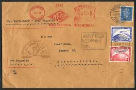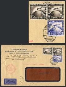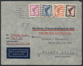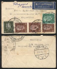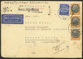 63 ALEMANIA - HISTORIA POSTAL Sobre / N°Cat.: Buena-MB 15/AGO/1929 Freidrichshafen - Argentina: Sobre comercial aéreo enviado por Zeppelin hasta Lakehurst (USA) con destino final Buenos Aires, franqueado con 10Mk. (Sc.C36 + pareja C37), al dorso tránsito por Lakehurst y arribo a Buenos Aires el 18/SEP, mínimos defectitos, excelente aspecto, muy interesante! Precio inicial: US$ 150 Precio actual: US$ 150 Oferte US$ 150 o más | |