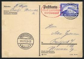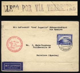 64 ALEMANIA - HISTORIA POSTAL Sobre / N°Cat.: Buena Sobre volado por ZEPPELIN, enviado el 18/MAY/1930 de Friedrichshafen a Barcelona (España) con franqueo de 2Mk. (Sc.C26), al dorso interesante marca "LLEGO POR VIA TERRESTRE" en violeta, doblez en la parte inferior del sobre, sino MB calidad Precio inicial: US$ 25 Precio actual: US$ 25 Oferte US$ 25 o más | |