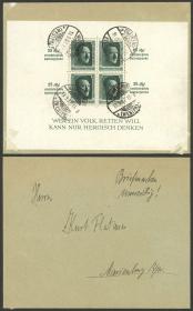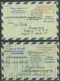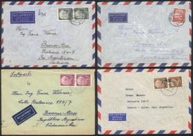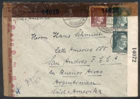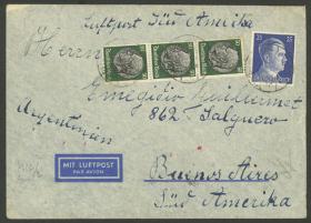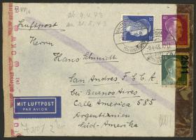 57 ALEMANIA - HISTORIA POSTAL-MARINOS DEL GRAF SPEE Sobre / N°Cat.: Buena CORRESPONDENCIA DE MARINOS DEL ACORAZADO GRAF SPEE al principio "internados" y luego "prisioneros" de guerra en varios campos de Argentina: Sobre aéreo enviado el 1/OCT/1940 por el Sr. Alfres Oberländer en Chemnitz a su amigo Erich Pilz en Buenos Aires, dirigido a la Embajada Alemana para que ésta lo entregara al marino. Tiene un franqueo de 3,25M. (un sello con defectitos), muy buena calidad general, al dorso tiene censura nazi, raro! Precio inicial: US$ 200 Precio actual: US$ 200 Oferte US$ 200 o más | |