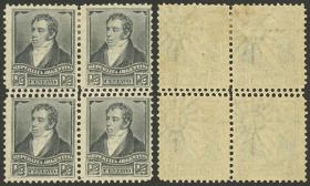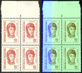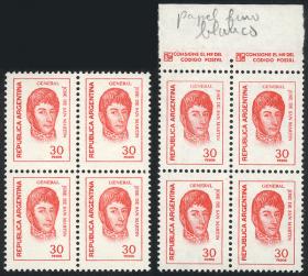 196 ARGENTINA - EMISIONES GENERALES Cuadro / Nuevo Mint N°Cat.: GJ.1758B+1758 MB. GJ.1758B + 1758, Rarísimo FIN DE BOBINA uniendo los papeles mate FLUORESCENTE con mate fosforescente, cuadro con los sellos izquierdos impresos un 50% aprox. en cada papel, rarísimo, solo 5 cuadritos conocidos! Precio inicial: US$ 250 Precio actual: US$ 250 Oferte US$ 250 o más | |