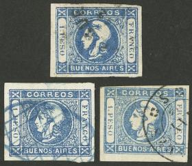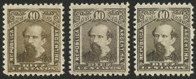 151 ARGENTINA - EMISIONES GENERALES Lote / Nuevo Mint N°Cat.: GJ.110 MB. GJ.110, 1889 10c. Avellaneda, lote con los tipos I, II y III: con suaves perlitas en las franjas blancas y ténue rayita en la frente, con las perlitas pero sin rayita en la frente, y sin la perlitas). Estos 3 tipos distintos se dan por desgaste de la plancha impresora, nuevos mint de excelente calidad, raro conjunto! Precio inicial: US$ 25 Precio actual: US$ 25 Oferte US$ 28 o más | |