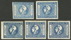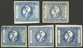 137 ARGENTINA - CABECITAS Lote / Sin usar (sin goma) N°Cat.: GJ.17 Valor de catál.: US$200 MB. GJ.17, 1P. Azul impresiones semiborrosas, 5 ejemplares con degradé de colores: celeste, azul claro, azul, azul verdoso y azul oscuro, muy buen conjunto! Precio inicial: US$ 75 Precio actual: US$ 75 Oferte US$ 75 o más | |