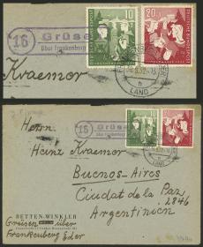 103 ALEMANIA OCCIDENTAL - EMISIONES GENERALES Sobre / N°Cat.: Yv.39/40 Valor de catál.: Euros 60++ MB. Yvert 39/40, 1952 Pro Juventud, SC de 2 valores franqueando un sobre enviado a Argentina el 30/SEP/1952, al dorso arribo a Buenos Aires el 27/OCT, muy buena calidad! Precio inicial: US$ 25 Precio actual: US$ 25 Oferte US$ 25 o más | |