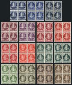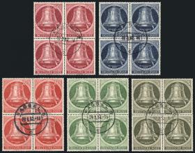 96 ALEMANIA - BERLÍN - EMISIONES GENERALES Cuadro / Nuevo o Nuevo Mint N°Cat.: Yv.61/65+otros Valor de catál.: Euros 1.030 MB. Yvert 61/65 + 68/72 + 87/91, 1951, 1952 y 1953 Campana de la Libertad, las 3 series completas de 5 valores en cuadros, los sellos de arriba con ínfima marquita de bisagra apenas visible, los de abajo mint, excelente calidad, valor de catálogo Euros 1.030 Precio inicial: US$ 150 Precio actual: US$ 150 Oferte US$ 165 o más | |