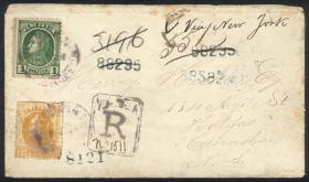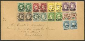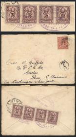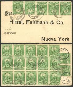 346 PERÚ - HISTORIA POSTAL Sobre / N°Cat.: MB. 18/ABR/1899 Piura a New York, sobre franqueado con 22 sellos de 1c. (Sc.142) para pagar los 22c. de porte doble + 2c. por el cruce del istmo de Panamá, con arribo a destino el 3/MAY, excelente calidad, espectacular! Precio inicial: US$ 200 Precio actual: US$ 200 Oferte US$ 221 o más | |