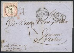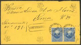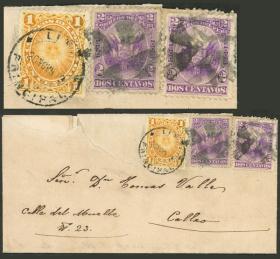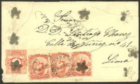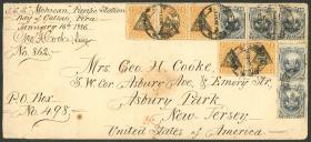 338 PERÚ - HISTORIA POSTAL Sobre / N°Cat.: MB. 16/ENE/1886 Callao a Estados Unidos vía Panamá, sobre franqueado con 55c. (tarifa quíntuple), incluye 5 sellos de 1c. con sobrecarga "triángulo", al dorso tiene un tránsito por New York y arribo a Asbury Park, muy buena calidad, raro! Precio inicial: US$ 500 Precio actual: US$ 500 Oferte US$ 550 o más | |