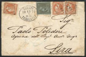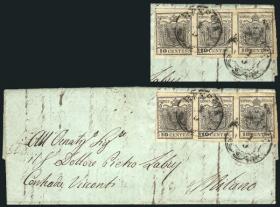 248 ITALIA - LOMBARDO-VÉNETO Sobre / N°Cat.: Sc.3 Valor de catál.: US$2.250 MB. Carta completa enviada desde Brescia (1/MAY/1852) a Milano, franqueada con tira de 3 del Sc.3 (total 30c.), con dos mat. fechadores bien aplicados y arribo a Milano. La tira tiene sus márgenes completos, amplios, y la carta es de MB calidad, valor según Scott US$2.250 Precio inicial: US$ 500 Precio actual: US$ 500 Oferte US$ 500 o más | |