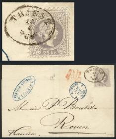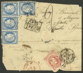 222 FRANCIA - HISTORIA POSTAL Pieza / N°Cat.: Buena RARO RECORRIDO y DOBLE PAGO DE TARIFA FRANCESA: Gran parte de un sobre enviado en diciembre de 1873 de Buenos Aires a Mazzenes (Altos Pirineos), despachado en la CARTERÍA "E" de Buenos Aires donde le colocaron el correspondiente franqueo argentino de 5c. y el francés de 1Fr. (4x 25c.) para ser encaminado por el Correo Francés hasta su destino (seguramente por las Mensageries Imperiales). Por algún motivo no llegó al barco francés y la reencaminaron por el Correo Inglés en Buenos Aires, arribando a London el 15/ENE/1874 y de allí a Francia (ver marca de tasa de intercambio anglo-francesa de 1,60Fr.), doble pago ya que no fue reconocido el franqueo francés adherido en origen, y que fué matasellado en Francia. Si bien no es un sobre completo y tiene algunos defectitos, su aspecto es muy bueno y es un caso extremadamente raro de cambio de recorrido! Precio inicial: US$ 100 Precio actual: US$ 100 Oferte US$ 100 o más | |