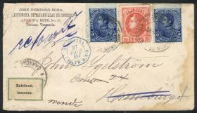 394 VENEZUELA - HISTORIA POSTAL Sobre / N°Cat.: Buena-MB Sobre certificado enviado en SEP/1929 de Caracas a Argentina con franqueo de 1,40Bs. con indicación "s/s Magdalena, vía Trinidad". Al dorso tiene tránsitos por Colón (23/SEP), Valparaíso (8/OCT) y arribo a Buenos Aires el 12/OCT, con un doblez que no afecta al franqueo, MB!! Precio inicial: US$ 100 Precio actual: US$ 100 Oferte US$ 100 o más | |