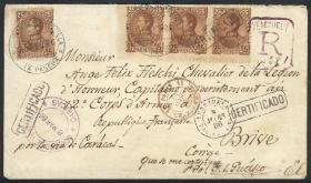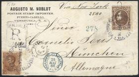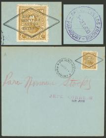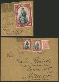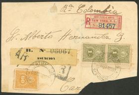 292 PARAGUAY - HISTORIA POSTAL Error / N°Cat.: Buena-MB 25/SEP/1900 Asunción a COLOMBIA, frente de un sobre certificado, franqueado con 2,60P., con etiqueta de tránsito aplicada en New York, muy raro destino y franqueo, ex.Loeb (su precio de venta: US$250) Precio inicial: US$ 100 Precio actual: US$ 100 Oferte US$ 100 o más | |