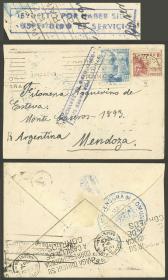 209 ESPAÑA - HISTORIA POSTAL Sobre / N°Cat.: MB. 14/OCT/1940 Barcelona - Argentina, sobre enviado con franqueo de 40c., con marca rectangular azul al frente: "DEVUELTO POR HABER SIDO SUSPENDIDO EL SERVICIO", al dorso marca redonda de censura, y arribo a Buenos Aires el 27/ENE/1941, excelente calidad, raro! Precio inicial: US$ 100 Precio actual: US$ 100 Oferte US$ 100 o más | |