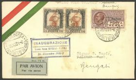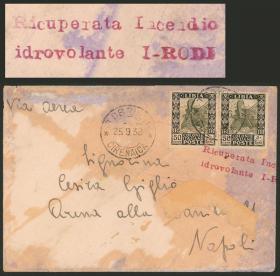 263 LIBIA - HISTORIA POSTAL Sobre / N°Cat.: MB. ACCIDENTE DE AVIÓN: Sobre aéreo que era transportado en un hidroavión de ALA LITTORIA con destino Italia, que sufrió un accidente a la altura de Benghazi (Libia), parte del correo fué recuperada y recibió la marca roja: "Ricuperata Incendio - idrovolante I-RODI" al frente y dorso, MB y raro! Precio inicial: US$ 300 Precio actual: US$ 300 Oferte US$ 300 o más | |