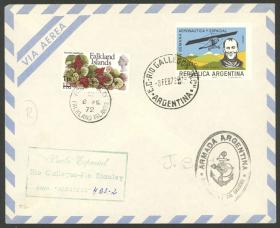 266 MALVINAS (FALKLAND I.) - HISTORIA POSTAL Sobre / N°Cat.: MB. RARO VUELO, 8/FEB/1972: Sobre transportado en el segundo vuelo efectuado por la Aviación Naval para transladar a miembros de la B.B.C. de Londres a Port Stanley, avión Albatros 4 BS-2, comandante: Capitán Flores Godoy, se transportaron menos de 50 sobres! Precio inicial: US$ 150 Precio actual: US$ 150 Oferte US$ 150 o más | |
