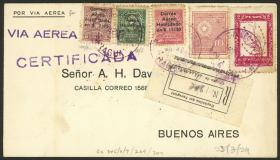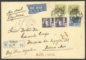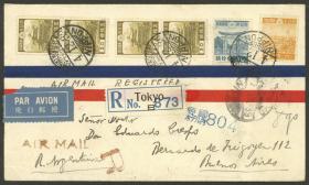 260 JAPÓN - HISTORIA POSTAL Sobre / N°Cat.: MB. Sobre aéreo certificado enviado el 13/ABR/1940 de Tokyo a Argentina, con bonito franqueo con matasello fechador del "IMPERIAL HOTEL PO - TOKYO", al dorso tránsito por San Francisco el 27/ABR y arribo a Buenos Aires, MB! Precio inicial: US$ 100 Precio actual: US$ 100 Oferte US$ 100 o más | |