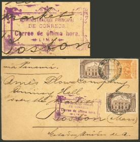 344 PERÚ - HISTORIA POSTAL Sobre / N°Cat.: MB. 15/MAR/1898 Lima a Boston, sobre enviado vía Panamá con franqueo de 24c. (2c. por ser un envío de última hora + 22c. por el envío vía de Panamá), con atractiva marca violeta del CORREO DE ÚLTIMA HORA, al dorso tránsito y arribo a destino el 2/ABR, excelente calidad! Precio inicial: US$ 150 Precio actual: US$ 250 Oferte US$ 275 o más | |