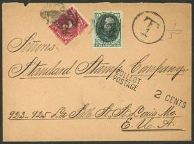 342 PERÚ - HISTORIA POSTAL Sobre / N°Cat.: MB. FALTA DE FRANQUEO Y MULTA: Sobre enviado el 14/SEP/1895, con franqueo de 10c., de Huamachuco a New York, vía Payta, donde la multaron por la falta de 1c. de franqueo (para el tránsito vía Panamá), y le aplicaron la marca "T" en doble círculo, tiene al dorso marcas de tránsito por Payta, N.York y arribo a Saint Louis el 4/OCT donde le aplicaron un sello de multa de 2c., excelente calidad, raro! Precio inicial: US$ 250 Precio actual: US$ 250 Oferte US$ 250 o más | |
