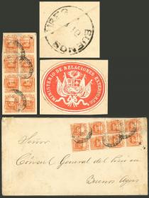 341 PERÚ - HISTORIA POSTAL Sobre / N°Cat.: MB. RARO SOBRE OFICIAL: Sobre franqueado con 8 sellos de servicio oficial de 5c. (Sc.O4, total 40c.!!), enviado el 14/NOV/1891 de Lima a Buenos Aires, al dorso tiene una atractiva viñeta de cierre del Ministerio de Relaciones Exteriores y marca de arribo a destino, muy buena calidad, raro!! Precio inicial: US$ 500 Precio actual: US$ 500 Oferte US$ 500 o más | |