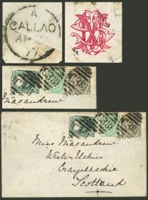 329 PERÚ - HISTORIA POSTAL Sobre / N°Cat.: MB. 20/ABR/1877 Callao a Escocia, sobre con franqueo peruano de 10c. + sellos ingleses por 1/6, anulados con matasello inglés "C38" del Callao, al dorso fechador de la Agencia Postal Inglesa, muy buena calidad! Precio inicial: US$ 300 Precio actual: US$ 300 Oferte US$ 300 o más | |