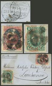 332 PERÚ - HISTORIA POSTAL Sobre / N°Cat.: MB. TARIFA DE IMPRESO A SUIZA: Sobre abierto que contenía algún impreso o tarjeta personal, franqueado con 3c. (Sc.38 y 39!!) y enviado a Lausanne en DIC/1881, al dorso tiene marca de arribo el 30/ENE/1887, excelente calidad, raro! Precio inicial: US$ 250 Precio actual: US$ 250 Oferte US$ 250 o más | |