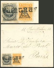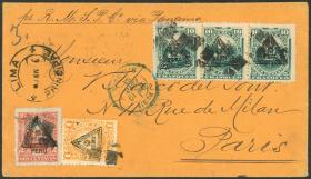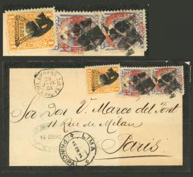 335 PERÚ - HISTORIA POSTAL Sobre / N°Cat.: MB. TRIPLE PORTE: Sobre enviado el 18/ENE/1884 de Lima a Paris con un hermoso franqueo de 33c. formado con sellos con sebrecarga "triángulo", arribo a destino al frente (19/FEB), excelente calidad, ex-Herbert Moll Precio inicial: US$ 200 Precio actual: US$ 264 Oferte US$ 291 o más | |