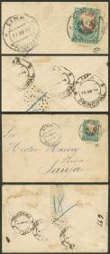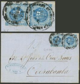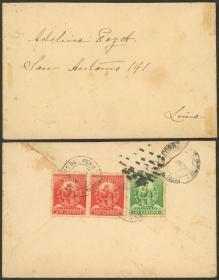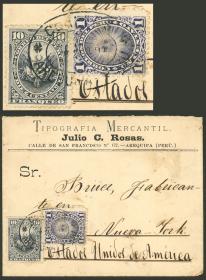 340 PERÚ - HISTORIA POSTAL Sobre / N°Cat.: MB. 18/SEP/1891 Arequipa a New York vía Panamá, sobre con membrete impreso "Tipografía Mercantil" franqueado con 11c. anulados con linda marca en doble óvalo de Arequipa, al dorso tiene tránsito por Lima el 27/SEP y arribo a destino el 26/OCT, muy buena calidad! Precio inicial: US$ 150 Precio actual: US$ 150 Oferte US$ 150 o más | |