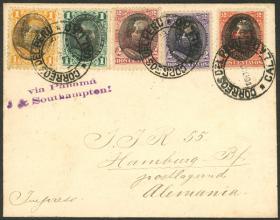 343 PERÚ - HISTORIA POSTAL Sobre / N°Cat.: MB. 10/DIC/1895 Callao a Alemania, sobre con indicación "IMPRESOS" manuscrito en el ángulo inferior izquierdo, con franqueo multicolor de sellos sobrecargados con la cara del Pte. Morales Bermudez, al dorso tiene arribo a Hamburg el 11/ENE/1896, excelente calidad! Precio inicial: US$ 100 Precio actual: US$ 100 Oferte US$ 100 o más | |