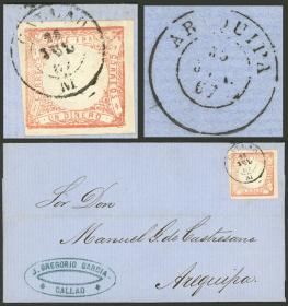 336 PERÚ - HISTORIA POSTAL Sobre / N°Cat.: MB. FEB/1885 Arequipa a Paris, sobre franqueado con 1c. combinando sello de 10c. Escudo con grilla en relieve con sobrecarga local AREQUIPA entre dos círculos (Sc.3N15) + 1c. Sol con sobrecarga triángulo, cancelados con un matasello lineal "AREQUIPA" perfectamente aplicado, al dorsotiene marcas de tránsito por Lima el 17/FEB y arribo a Paris el 27/MAR, MB calidad, raro! Precio inicial: US$ 300 Precio actual: US$ 441 Oferte US$ 486 o más | |