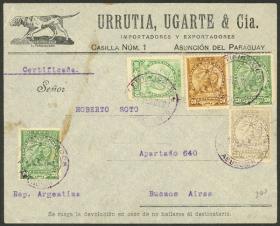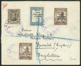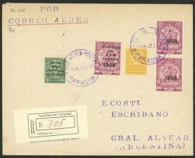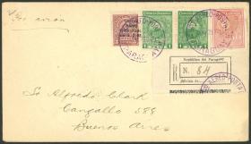 284 PARAGUAY - EMISIONES GENERALES Sobre / N°Cat.: Yv.345, 346, 348 var. MB. 3 Sobres certificados franqueados cada uno con Yv.345,348,348 c/variedad "banderas con CRUZ OMITIDA". Cada sobre tiene entre su franqueo una de las estampillas con variedad CRUZ DE MALTA OMITIDA en las banderas de las carabelas (Cat. especializado Kneitschel 382b, 384a, 385a). Todos tienen mat. oval certificado de Asunción 31/AG/1940 y arribo a Buenos Aires al dorso, MB calidad! Precio inicial: US$ 200 Precio actual: US$ 200 Oferte US$ 200 o más | |