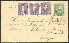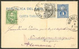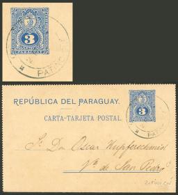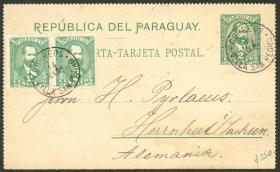 287 PARAGUAY - HISTORIA POSTAL Sobre / N°Cat.: MB. Carta postal de 3c. + 3c. adicionales, enviada en AGO/1896 de COLONIA NUEVA GERMANIA a Alemania, con tránsito por Asunción el 17/AGO y arribo, MB calidad, ex-Loeb (su precio de venta: US$160) Precio inicial: US$ 100 Precio actual: US$ 100 Oferte US$ 100 o más | |