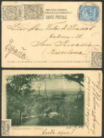 290 PARAGUAY - HISTORIA POSTAL Sobre / N°Cat.: MB. 5/MAR/1899 SAPUCAY a Alemania, carta postal de 2c. + 15c. adicionales (total 17c.), con matasellos rectangulares "ESTAFETERO Nº6" y al dorso tránsito por Asunción y arribo, excelente calidad, rara, ex-Loeb (su precio de venta: US$350) Precio inicial: US$ 200 Precio actual: US$ 200 Oferte US$ 200 o más | |