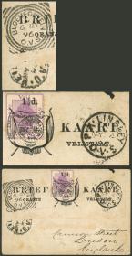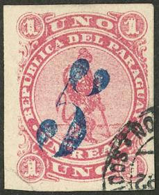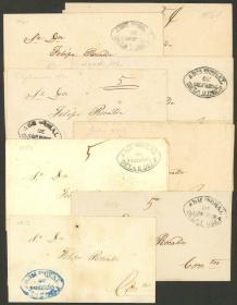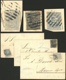 286 PARAGUAY - HISTORIA POSTAL Sobre / N°Cat.: MB. 8 Cubiertas enviadas a Corrientes entre 1856 y 1861, todas tienen la marca "ADM GRAL DE CORREOS DE LA R. DEL P." bien aplicadas en colores que van del azul (muy raro!) al negro intenso, pasando por gris, gris verdoso, etc.. varias tiene indicación de porte "4" a pluma, otras sin marca. Excelente conjunto!! Precio inicial: US$ 700 Precio actual: US$ 700 Oferte US$ 700 o más | |