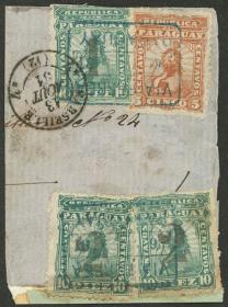 282 PARAGUAY - EMISIONES GENERALES Pieza / Usado N°Cat.: Sc.12+17/18 MB. Sc.12 + 17 + 18 x2 franqueando un fragmento grande de un sobre enviado a Francia, con matasellos rectangulares "VIA FERREA", y fechador de Marseille 13/AGO/1881, MB calidad, muy raro, ex-Loeb (su precio de venta: US$590) Precio inicial: US$ 250 Precio actual: US$ 250 Oferte US$ 250 o más | |