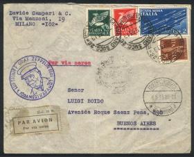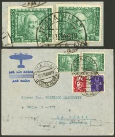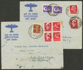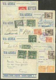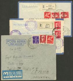 255 ITALIA - HISTORIA POSTAL Sobre / N°Cat.: MB. 3 Sobres aéreos (2 certificados) enviados de Roma a Argentina en 1941, VÍA LATI, con franqueos de 13L., 14L., y 14,50L., todos tiene atractivas censuras y marcas varias, muy buena calidad general! IMPORTANTE: Recomiendo mirar TODAS las fotos de este conjunto, todo su contenido está escaneado de ambos lados. Precio inicial: US$ 100 Precio actual: US$ 100 Oferte US$ 100 o más | |