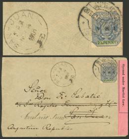 381 TRANSVAAL - HISTORIA POSTAL Sobre / N°Cat.: MB. RARO DESTINO: Sobre enviado el 20/SEP/1901 de Johannesburg a Argentina con franqueo de 2½p., tiene una atractiva faja de censura y marca oval ténue sobre el franqueo, además de arribo a San Juan el 14/NOV. Al dorso tiene otras marcas de tránsito, etc., excelente calidad, rarísimo destino para esta época!! Precio inicial: US$ 250 Precio actual: US$ 250 Oferte US$ 250 o más | |