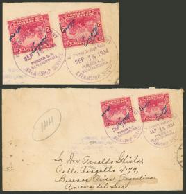 269 NICARAGUA - HISTORIA POSTAL Sobre / N°Cat.: MB. RARO DESTINO: Sobre enviado el 15/SEP/1934 de BLUEFIELDS a Argentina con franqueo de 4c. (2x 2c. con sobrecargas de marcas de control imitando una firma), con sendos matasellos color lila: "UNITED FRUIT COMPANY STEAMSHIP SERVICE - Posted on High Seas - PURSER S.S. - BAJA CALIFORNIA", al dorso tiene arribo a Buenos Aires el 17/OCT, MB calidad, raro! Precio inicial: US$ 250 Precio actual: US$ 250 Oferte US$ 250 o más | |