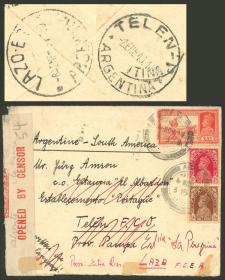 245 INDIA - HISTORIA POSTAL Sobre / N°Cat.: MB. RARO DESTINO: Sobre aéreo enviado el 4/NOV/1939 de Agra a Argentina: primero a Telén (La Pampa) y desde allí redirigido a Laza (Entre Ríos), con linda faja de censura y al dorso las raras marcas de TELEN (2/ENE/1949) y LAZA (6/ENE), muy buena calidad, raro! Precio inicial: US$ 100 Precio actual: US$ 100 Oferte US$ 111 o más | |