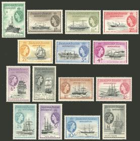265 MALVINAS (FALKLAND I.) - EMISIONES GENERALES Serie / Nuevo con bisagra N°Cat.: Yv.51/65 Valor de catál.: Euros 340 MB. Yvert 51/65, 1954 Barcos, serie completa de 15 valores nuevos con ínfima marquita de bisagra apenas visible (parecen mint), excelente calidad! Precio inicial: US$ 90 Precio actual: US$ 90 Oferte US$ 90 o más | |