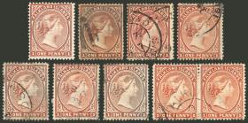 264 MALVINAS (FALKLAND I.) - EMISIONES GENERALES Lote / Usado o sin usar N°Cat.: Buena-MB Lindo conjunto de sellos de 1p. de 1883 a 1902, uno nuevo con goma original y 8 usados (incluyendo una pareja), variedad de colores (algunos muy interesantes), muy buena calidad general (un ejemplar usado con peladura al dorso, el resto impecable!) Precio inicial: US$ 100 Precio actual: US$ 100 Oferte US$ 100 o más | |