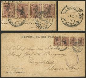 285 PARAGUAY - SERVICIO OFICIAL Sobre / N°Cat.: Sc.O17 Buena-MB Sc.O17, 1889 5c. sobre 15c., tira de 4 (total 20c.) franqueando un sobre oficial de la Dirección de Correos enviado a Buenos Aires el 20/DIC/1889, al dorso tiene marca de arribo el 27/DIC, rarísimo!! Precio inicial: US$ 1000 Precio actual: US$ 1000 Oferte US$ 1000 o más | |