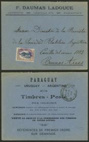 299 PARAGUAY - HISTORIA POSTAL Sobre / N°Cat.: MB. Sobre con publicidad al dorso de un comerciante filatélico de la época, enviado de Asunción a Buenos Aires con franqueo de 50c., al dorso tiene arribo a destino el 15/SEP/1912, excelente! Precio inicial: US$ 100 Precio actual: US$ 100 Oferte US$ 100 o más | |
