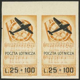 363 POLONIA - CUERPO POLACO - CORREO AÉREO Pareja / Nuevo o Nuevo Mint N°Cat.: Sa.3a MB. Sassone 3a, 1946 25 + 100L., hermosa PAREJA SIN DENTAR con borde de hoja superior, excelente calidad, con sellitos de garantía de Borzacki al dorso, rara! Precio inicial: US$ 200 Precio actual: US$ 200 Oferte US$ 200 o más | |