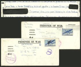 218 ESTADOS UNIDOS - HISTORIA POSTAL Sobre / N°Cat.: MB. 2 Cartas de un prisionero de guerra alemán de nombre Reimar W. Ziesmer enviados a Wien (en ese momento anexada por Alemania)en 1943 y 1944, desde los campos de prisioneros de Crossville y Papago Park, ambos con marcas de censura y el primero con parte de su texto censurado, MB calidad, muy interesantes! Precio inicial: US$ 100 Precio actual: US$ 100 Oferte US$ 100 o más | |