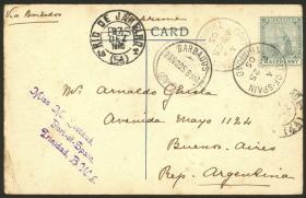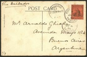 379 SURINAME - HISTORIA POSTAL Sobre / N°Cat.: MB. 26/MAR/1903 Paramaribo a Argentina, tarjeta postal franqueada con 3c. (Sc.79), con tránsitos por Georgetown (Guyana Británica) el 28/MAR y Barbados el 30/MAR, muy buena calidad, raro destino! Precio inicial: US$ 100 Precio actual: US$ 100 Oferte US$ 100 o más | |