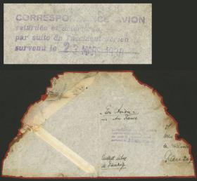 223 FRANCIA - HISTORIA POSTAL Sobre / N°Cat.: MB. ACCIDENTE DE AVIÓN: Parte de un sobre dirigido a Danzig, con evidentes signos de haber sido afectado por el fuego, recuperado del accidente del avión de AIR FRANCE en las proximidades de Corsavy (Pirineos), al incendiarse la máquina que procedía de Barcelona, en el que murieron el piloto Henri Guy, 2 tripulantes y 4 pasajeros, raro! Precio inicial: US$ 150 Precio actual: US$ 150 Oferte US$ 150 o más | |