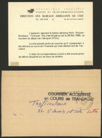 226 FRANCIA - HISTORIA POSTAL Sobre / N°Cat.: MB. ACCIDENTE DE AVIÓN: Faja con destino St. Severin que era transportada en el vuelo nocturno de Air France del 28/MAY/1969, que se incendió al despegar desde el aeropuerto de Orly, los tripulantes se salvaron pero gran parte de la correspondencia quedó destruída. Tiene la marca en dos líneas "COURRIER ACCIDENTÉ - en COUR de TRANSPORT" y la nota oficial explicando el hecho, MB calidad! Precio inicial: US$ 150 Precio actual: US$ 150 Oferte US$ 150 o más | |