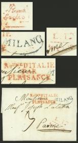 250 ITALIA - HISTORIA POSTAL Sobre / N°Cat.: MB. Carta completa fechada Milano 19/JUL/1808 y enviada a Parma, con marcas "MILANO" con semicírculo inferior, negra + "L.L. - MILANO" y "Rume. D´ITALIE - PAR - PLAISANCE" + al dorso arribo, todas en rojo, excelente calidad! Precio inicial: US$ 100 Precio actual: US$ 100 Oferte US$ 100 o más | |