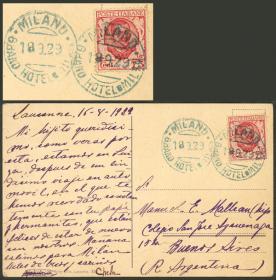 302 PARAGUAY - HISTORIA POSTAL Sobre / N°Cat.: Buena-MB Tarjeta postal enviada el 9/JUL/1919 desde Asunción a Suiza, fué despachada en un barco argentino con franqueo de 10c. y matasello "AGENTE POSTAL EMBARCADO Nº18", rara, ex-Loeb (su precio de venta: US$150) Precio inicial: US$ 100 Precio actual: US$ 100 Oferte US$ 100 o más | |