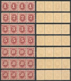 211 ESTADOS UNIDOS - SELLOS DE TASA Serie / Nuevo Mint N°Cat.: Sc.J22/J28 Valor de catál.: US$12.330+ MB. Sc.J22/J28, 1891 Serie completa de 7 valores en TIRAS DE 4, los sellos de los extremos izquierdo y derecho de ambas tiras con ínfimas y apenas imperceptibles marquitas de bisagra, y los del centro nuevos mint perfectos. La calidad es magnífica, la goma tan fresca como hace casi 120 años, los colores estupendos, son unas tiras dignas de una gran colección, tan lindas que dejarán satisfecho al coleccionista más exigente. Valor de catálogo para 2 series con marquita de bisagra + 2 series mint, sueltas, es US$12.330, y sin dudas estos múltiplos son muy raros y multiplican su valor! Precio inicial: US$ 3000 Precio actual: US$ 3000 Oferte US$ 3000 o más | |