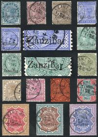 395 ZANZIBAR - EMISIONES GENERALES Serie / Usado N°Cat.: Sc.3/17 (sin 8 ni 12) Valor de catál.: US$450++ MB. Sc.3/17 (sin 8 ni 12), 1896/6 13 Valores de la serie de 15 (faltan los valores 3a. naranja y 1r. gris), INCLUYE VARIEDADES de Sc.6 y 7: en el 2a. ultramar se ven dos tipos diferentes de sobrecarga, en el 2a.6p. uno con variedad "Z" más alta, excelente calidad, muy interesantes, valor de catálogo Scott sin considerar las variedades US$450+ Precio inicial: US$ 250 Precio actual: US$ 250 Oferte US$ 250 o más | |