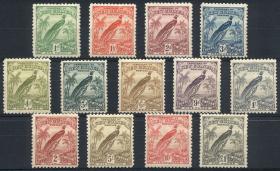 272 NUEVA GUINEA - EMISIONES GENERALES Serie / Nuevo con bisagra N°Cat.: Sc.31/45 Valor de catál.: US$293+ MB. Sc.31/45, 1932/4 Pájaros, serie completa de 15 valores nuevos con suave marquita de bisagra, muy buena calidad, valor de catálogo US$293+ Precio inicial: US$ 90 Precio actual: US$ 90 Oferte US$ 90 o más | |